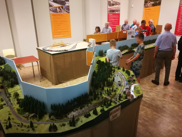 Die andere Gruppe hatte zwischenzeitlich Gelegenheit, die vom „Verein Schlesische Gebirgsbahnen e.V.“ aufgebaute Spur-N-Modellbahn, eine Modulanlage, anzusehen. Mit dem Thema „Zackenbahn“ passte diese Anlage haargenau zu dem Thema der Sonderausstellung.