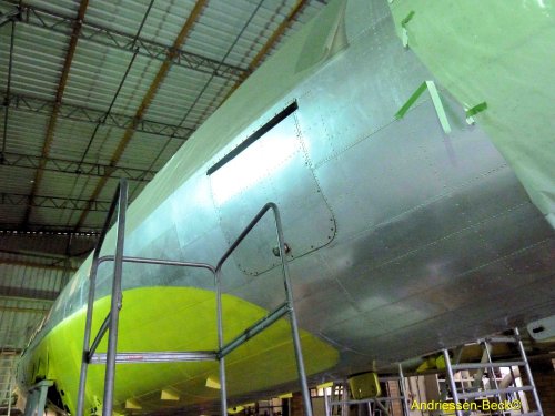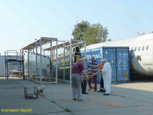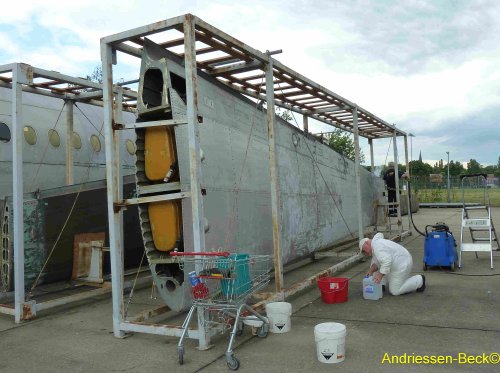 August 2016: Jetzt, im Sommer, werden die Tragflächen gereinigt. An den Rumpf angebaut werden können die Tragflächen erst am endgültigen Standort des Flugzeugs. Solange muss alles transpotabel bleiben. Wir hoffen auf eine baldige Lösung der Standortfrage, damit wir endlich mit dem Zusammenbau beginnen können, der bestimmt auch noch eine sehr große Aufgabe ist.