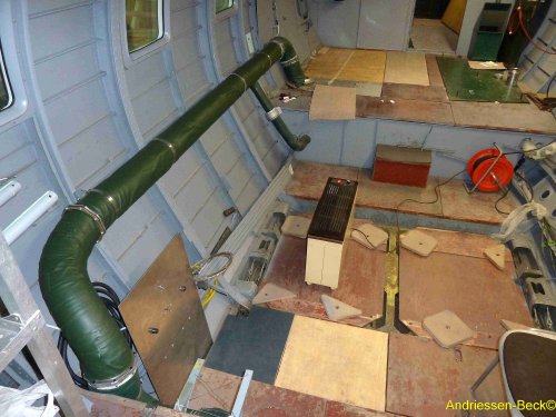 März 2016: Diese Heizungsrohre fehlten völlig, als das Museum das Flugzeug übernahm. Leider gab es für den Nachbau keinerlei alte Unterlagen, da das Heizungsrohr eine Spezialanfertigung war. Es wurde extra nach oben in die Kabine verlegt, weil im Boden die Luftbildkameras eingebaut wurden.