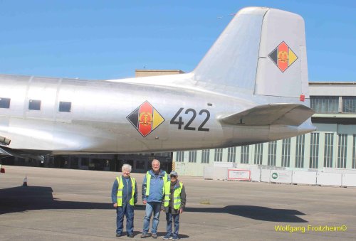 Davor stehen stolz zwei ehemalige Piloten und ein Luftbildoperateur, die einst zur Besatzung der 422 gehörten und sie jetzt mit aufgebaut haben.