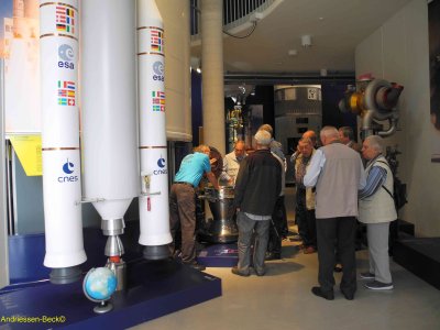 Anschließend führte Herr Frank uns durch die von ihm und seinem Kollegen aufgebaute Museumsausstellung zur europäischen Raumfahrtgeschichte nach 1945. Die beiden Herren waren von Beginn an (Europa-Rakete) am Standort Lampoldshausen beschäftigt und kennen daher alle historischen Details.